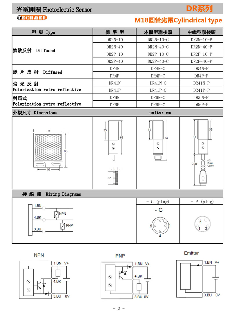 TECHMER DR2 DR4 DR6系列 圆管光电M18 埋入式镜头