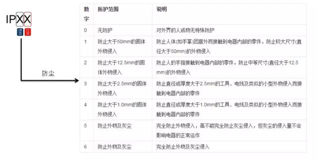 在这个标准中,针对电气设备外壳对异物的防护,IP等级的格式为IPXX,其中XX为两个阿拉伯数字,第一标记数字表示接触保护和外来物保护等级,第二标记数字表示防水保护等级。